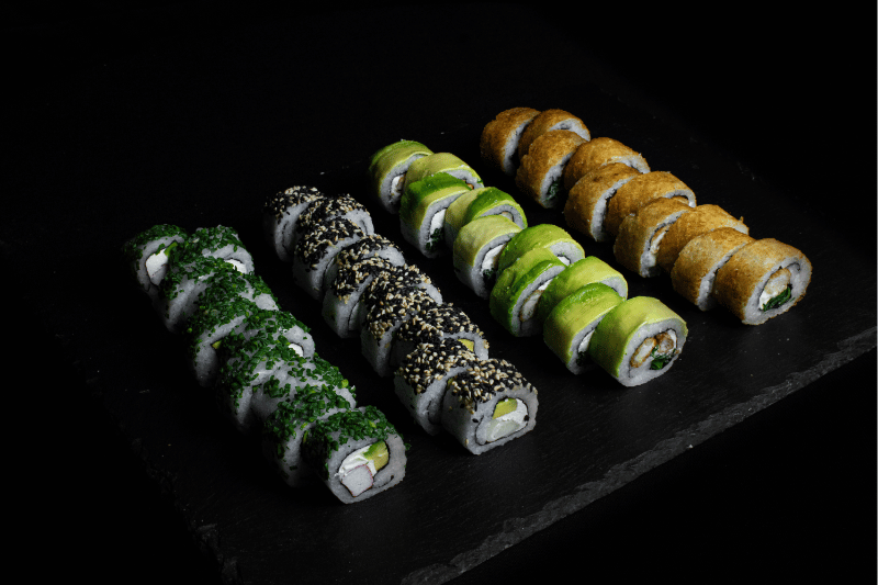 - 10 piezas roll relleno de palmito, queso y aguacate, cubierto con sésamo