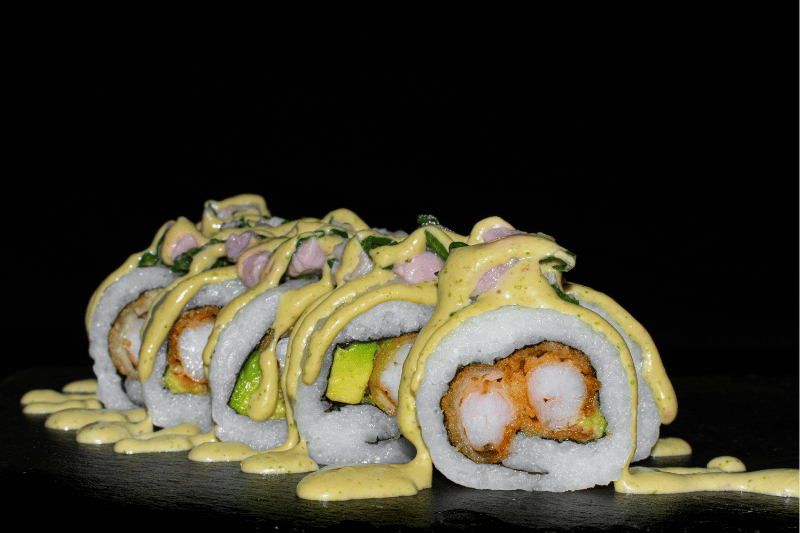 Roll relleno de gambas furay, aguacate, con topping de tartar de atún y salsa acevichada (10 piezas)