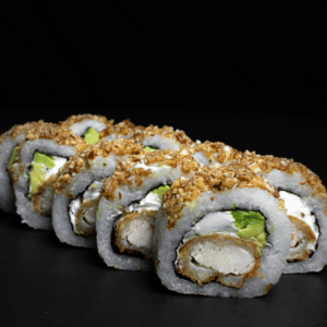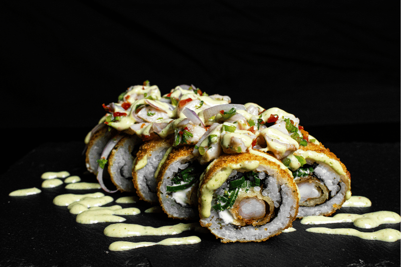 Roll frito en panko relleno de gambas, queso crema y cebolleta, cubierto con ceviche y salsa acevichada (10 piezas)