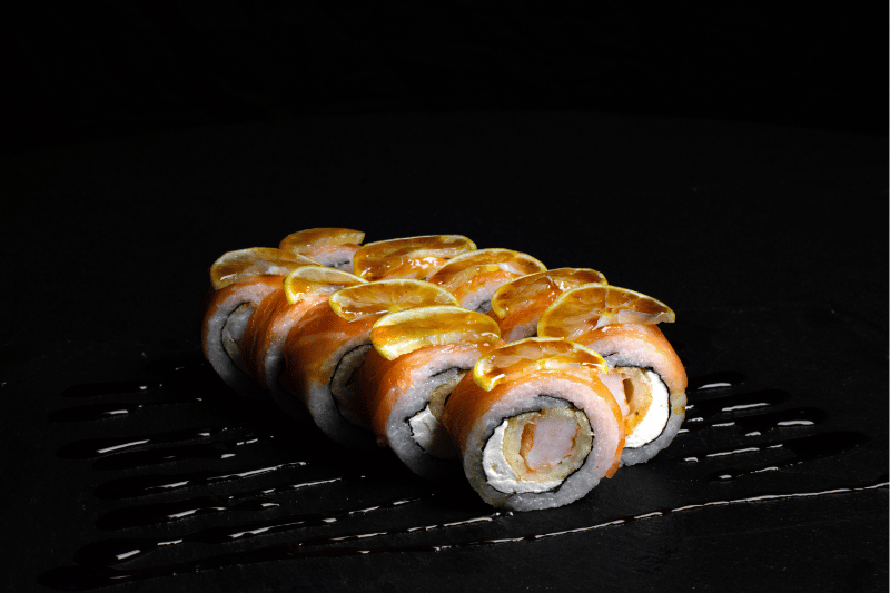 Roll relleno de gambas furay y queso crema, cubierto con salmón y un toque de lima (10 piezas)