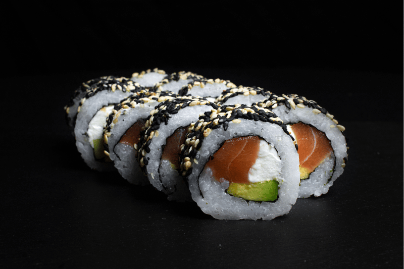 Roll relleno de salmón, queso crema y aguacate, cubierto con sésamo (10 piezas)