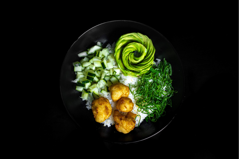 Bowl con arroz de sushi y fritos de coliflor, aguacate, pepino y cebolleta