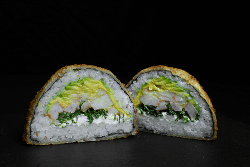 Sushi con forma de hamburguesa rellena de gambas, queso crema, aguacate y cebolleta (10 piezas)