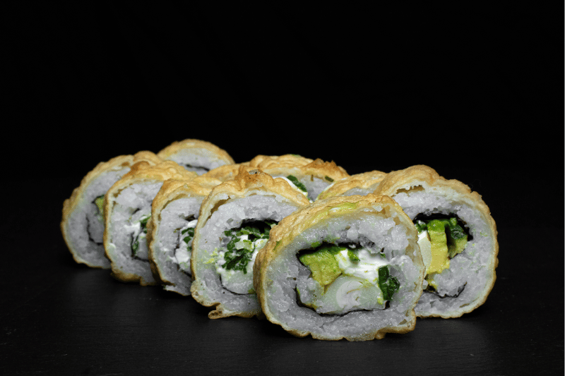 Roll frito en tempura relleno de palmito, queso crema, cebolleta y aguacate. (10 piezas)
