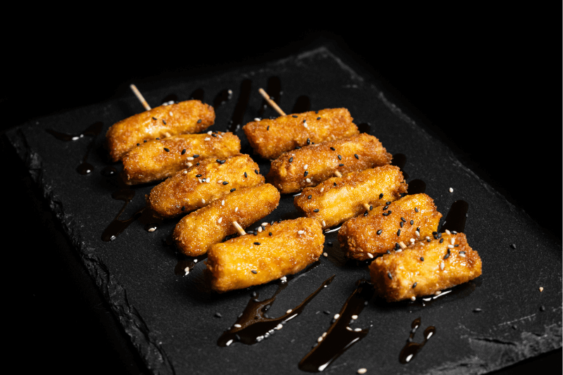 Brochetas de pollo apanado con salsa agridulce (2 unidades)